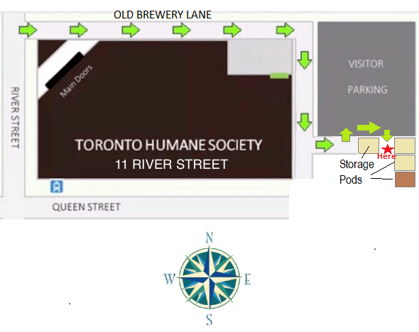 Outside a storage pod, in the parking lot at the back/east side of the of Toronto Humane Society (11 River Street, Toronto) – see the red star in the below map: