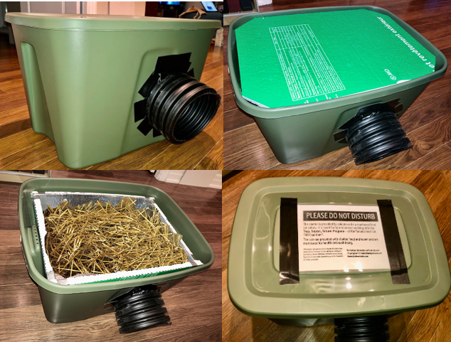 The totes have been used before as shelters but have been thoroughly cleaned, are in good shape, and have fresh insulation/straw. Varying colors/styles. (note: subject to availability) - STRAW: All our shelters are prefilled with straw.