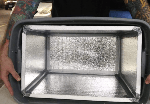 - Place the bottom, sides, and end pieces of Durofoam into the plastic totes