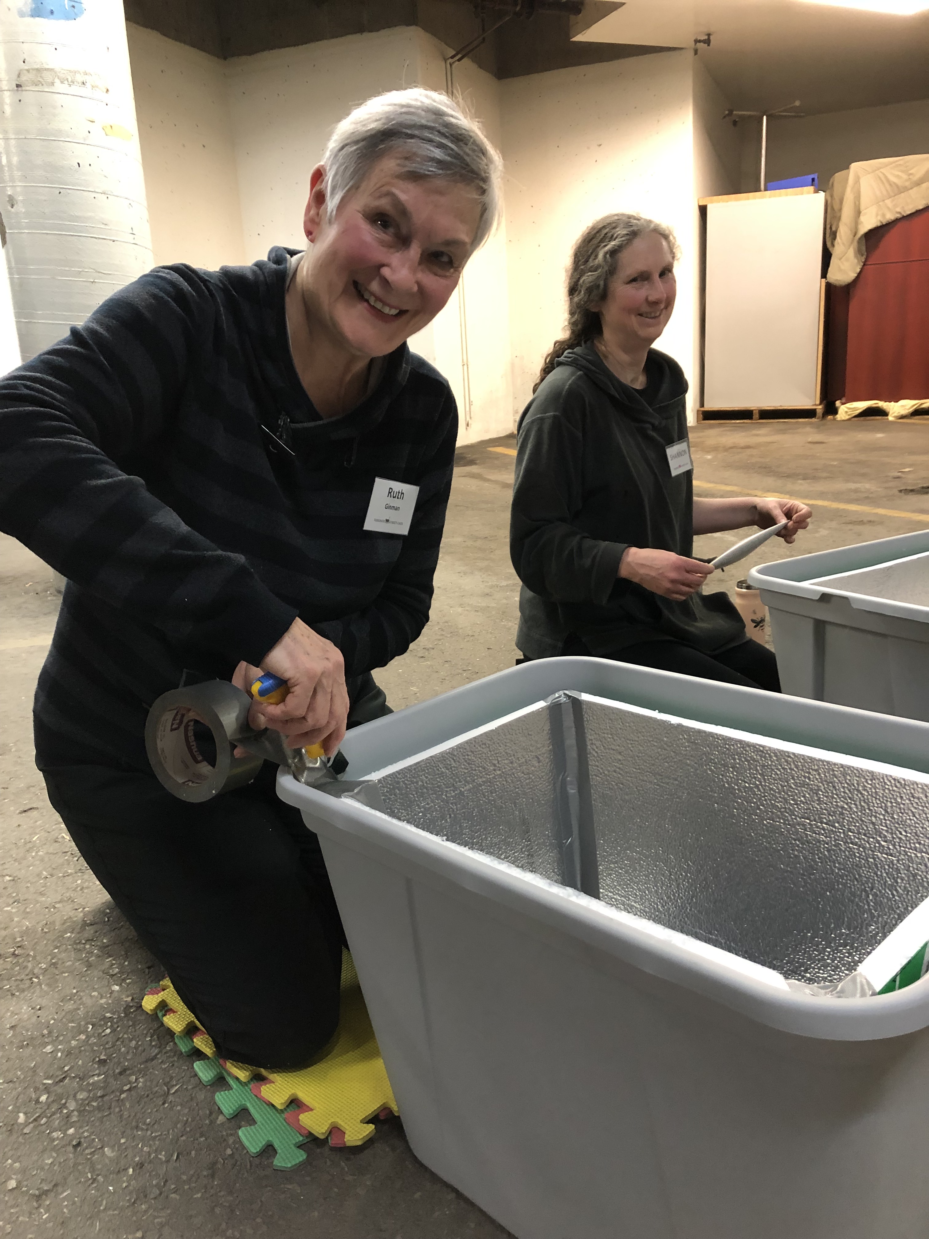 TAPING DUROFOAM PIECES INTO THE PLASTIC TOTES