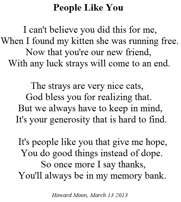 The owner, Howard Moon, was so grateful for all the help he wrote a poem for us “People Like You”